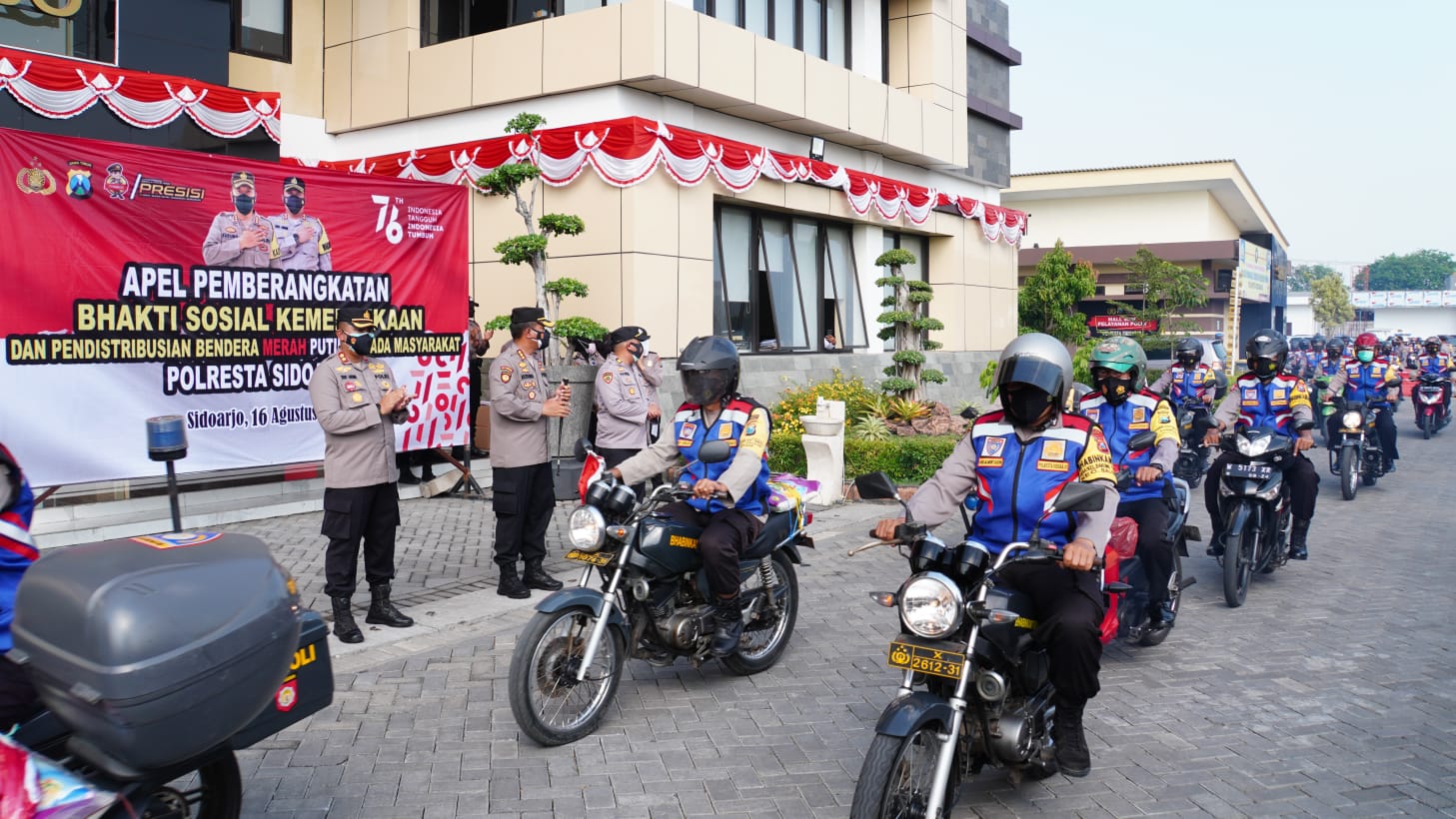 Pemberangkatan bhabinkamtibmas untuk mendistribusikan 5.000 bendera merah putih dan baksos bagi warga terdampak pandemi Covid-19 dalam rangka Dirgahayu Republik Indonesia ke-76, dilakukan di Mapolresta Sidoarjo, Senin (16/8/2021) oleh Kapolresta Sidoarjo Kombes Pol. Kusumo Wahyu Bintoro.