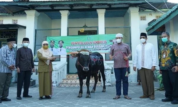 Penyerahan hewan kurban itu dilakukan secara simbolis oleh Wakil Bupati Dewi Khalifah, SH, MH, M.Pd.I didamping Sekretaris Daerah Ir. Edy Rasiyadi, M.Si, Direktur Operasional Bank BPRS Bakti Sumenep, Hairil Fajar kepada Ketua Remas Masjid Jamik Fauzi Al-Qodiri di Halaman Masjid Jamik Sumenep.