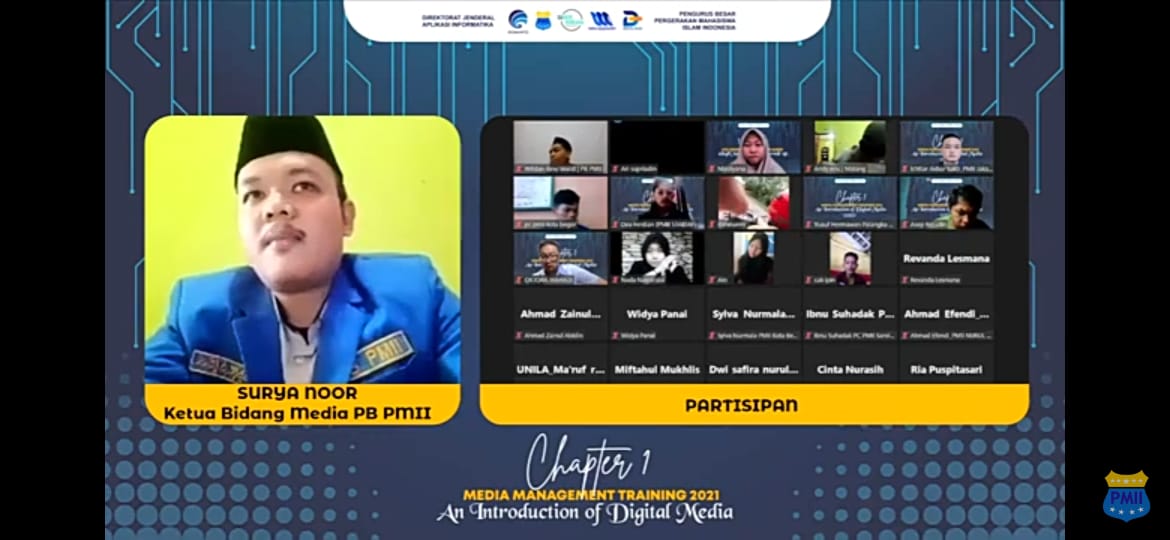 Jakarta,Salam News. Id –  PB PMII-Pengurus Besar Pergerakan Mahasiswa Islam Indonesia (PB PMII) melalui Pengurus Bidang Media dan Komunikasi Publik berkolaborasi dengan Kementerian Komunikasi dan Informatika (Kominfo) RI menyelenggarakan kegiatan Media Management Training (MMT) dan Digital Talk bagi kader-kader PMII yang ada di seluruh Indonesia, kegiatan ini dilaksanakan secara daring, Ahad (5/9/2021). MMT merupakan ruang belajar media digital untuk kader PMII yang memiliki minat di bidang media digital.
