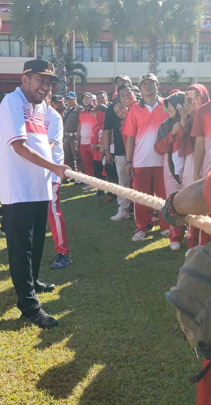 Pertandingan Eksibisi tarik tambang antara Tim Bupati, Sekdakab, Asisten dan Pimpinan OPD melawan Tim Kecamatan yang beranggotakan tujuh camat mengawali semarak lomba-lomba Agustus 2024. (Red/*)