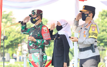 Gubernur Jawa Timur, Khofifah Indar Parawansa. Pangdam V Brawijaya, Mayjend TNI Suharyanto. Dan Kapolda Jawa Timur, Irjen Pol Nico Afinta. Menggelar Apel Kesiapan Larangan Mudik, kepada seluruh anggota TNI-Polri maupun PNS dan seluruh unsur komponen bangsa, yang hadir dalam apel.