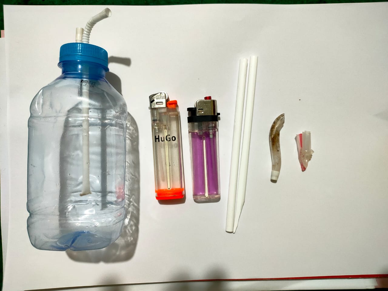 Hasil penggeledahan, petugas menemukan barang bukti berupa 1 set alat hisap/bong, 2 buah korek api, 2 buah sedotan plastik, satu klip plastik dan pipa kaca berisi sisa Sabu.